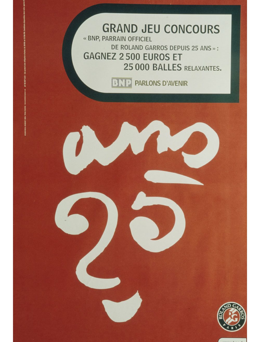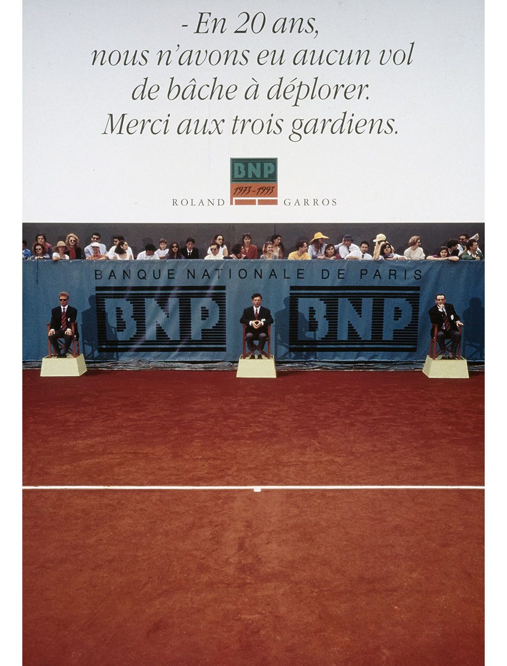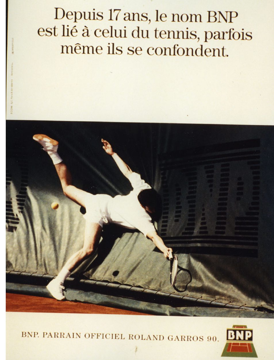 Un logotype est créé pour le 20e anniversaire du partenariat, en 1993. Il est décliné sur les tenues des ramasseurs de balles, les cartons d’invitations, des objets publicitaires, l’animation commerciale et dans les agences BNP. Enfin, la BNP bénéficie gracieusement dans le magazine officiel de Roland-Garros édité avant chaque tournoi annuel de la 4e de couverture en quadrichromie.