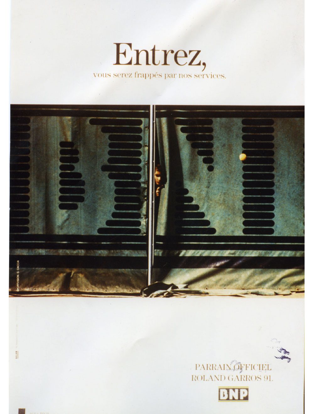 En 1987, la BNP lance une nouvelle identité visuelle lors du tournoi, en présentant un nouveau logo sur toutes les bâches de fond de courts, et obtient une présence exclusive. Présence exclusive également sur les deux faces du maillot des ramasseurs de balles, dont l’équipement est fourni par Adidas, fournisseur depuis 1974 de la FFT. À la même époque, la Banque complète sa participation par des films publicitaires TV, des annonces presse, le tout sous forme humoristique : « BNP la banque de Roland Garros », « BNP guichets ouverts à Roland Garros ». Dans les agences BNP, des affiches reprennent les thèmes des annonces presse. En effet, une photo sur deux prise à Roland-Garros offre une chance de laisser voir le logo.